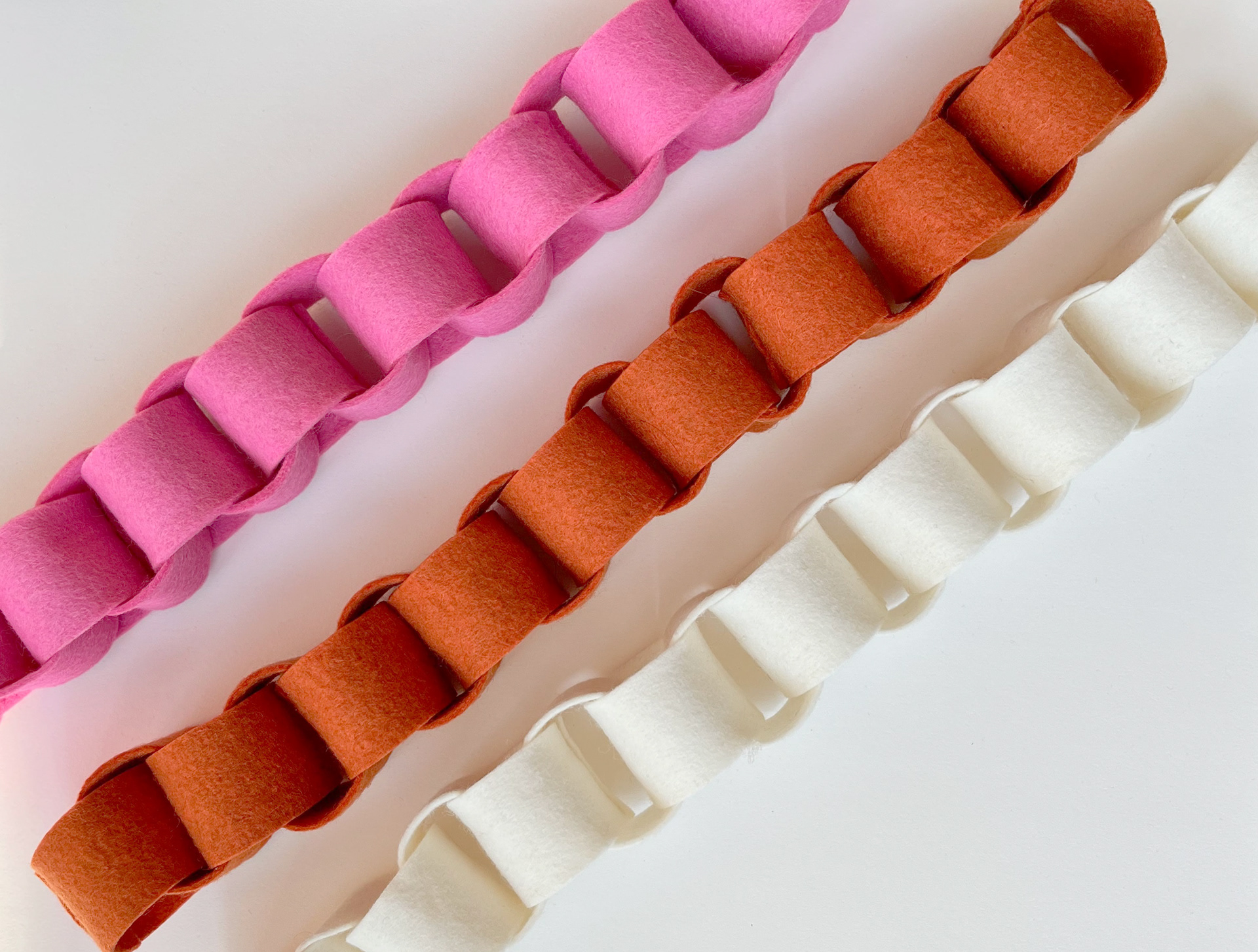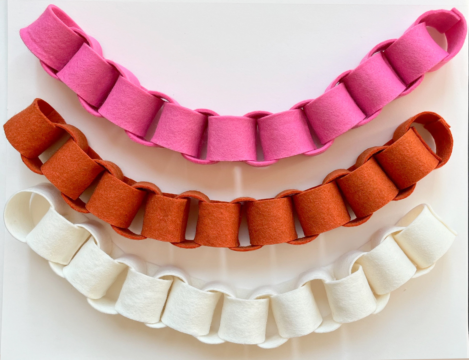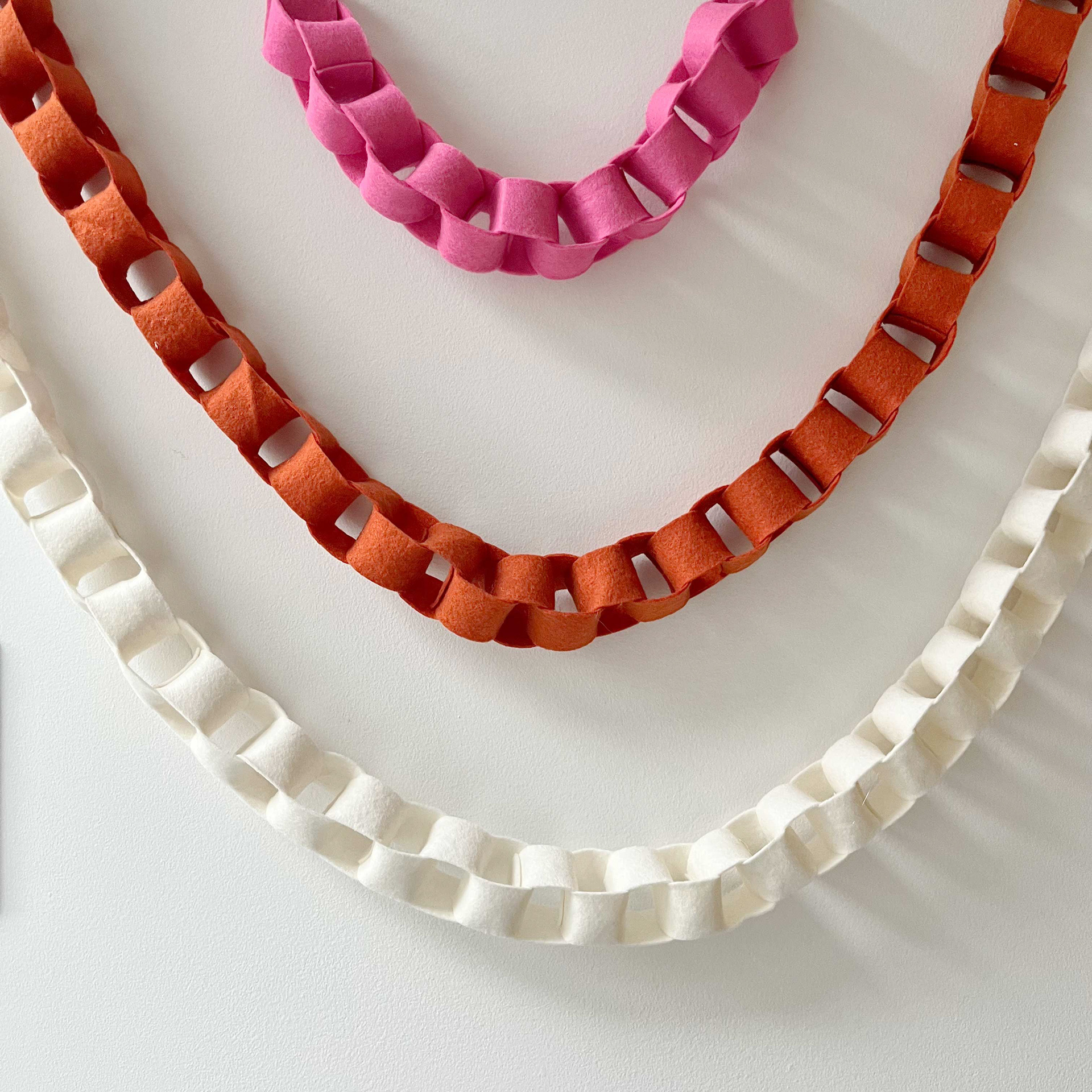 Add cozy texture and modern charm to your space with this handmade wool felt chain garland. Crafted in small Brooklyn batches from premium wool felt, each link brings warmth, color, and a timeless Scandinavian feel — perfect for mantels, shelves, windows, or festive décor all year long.