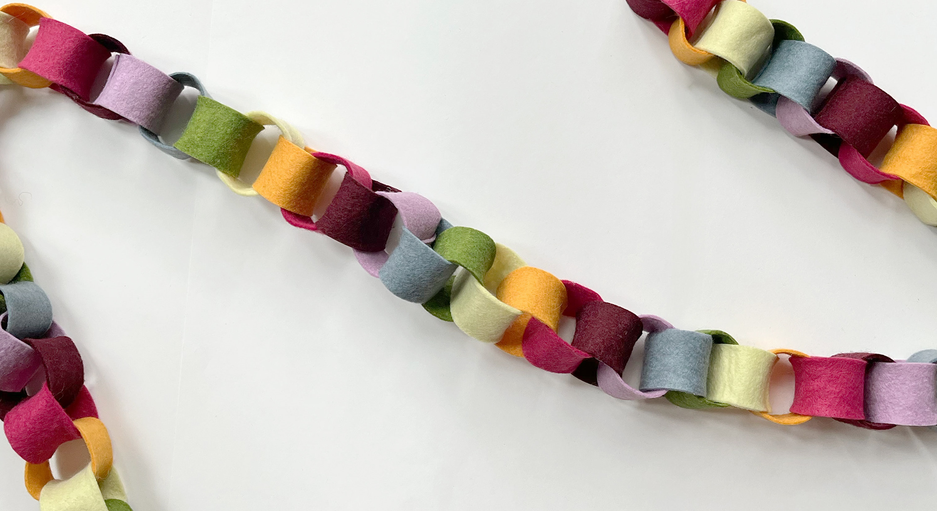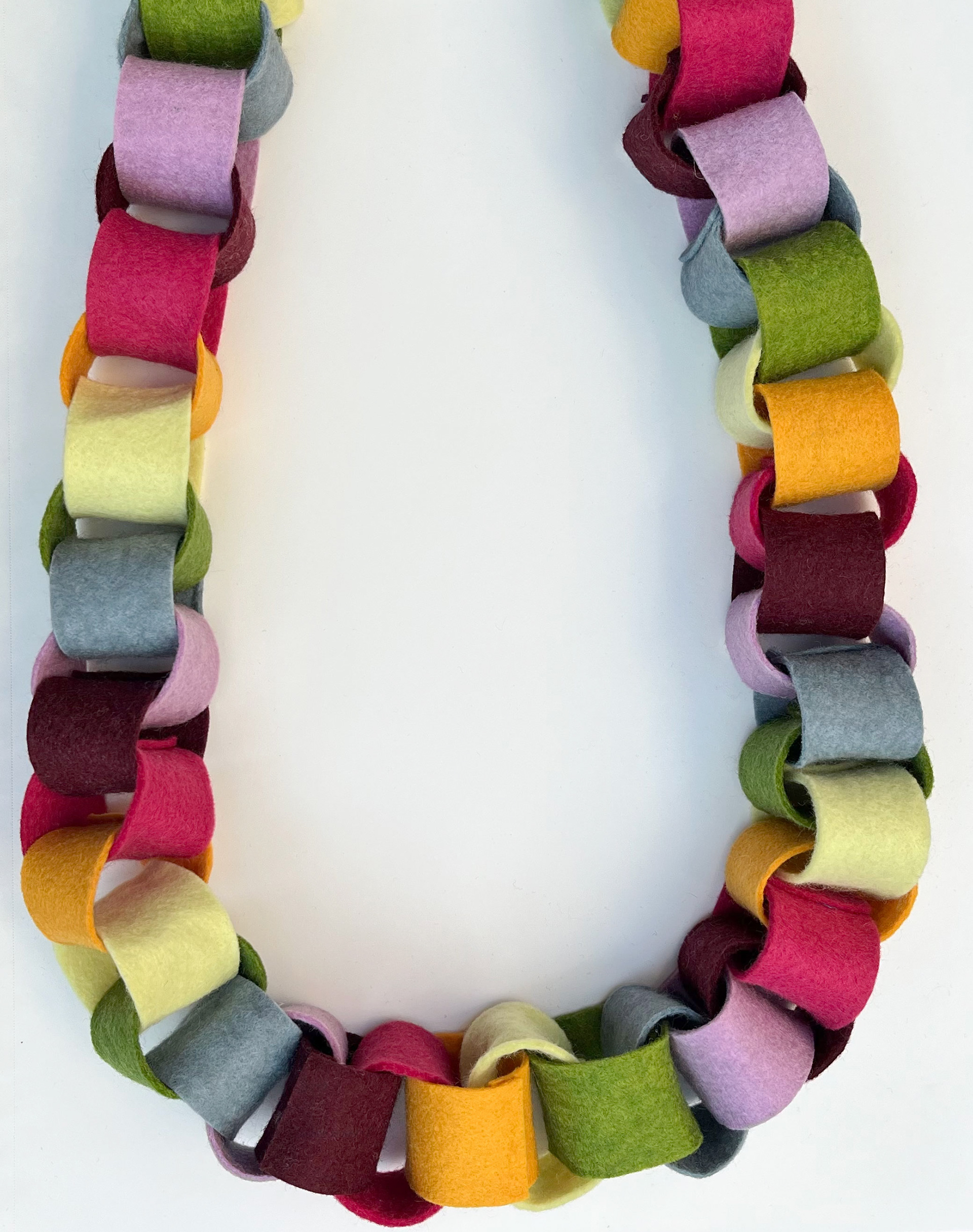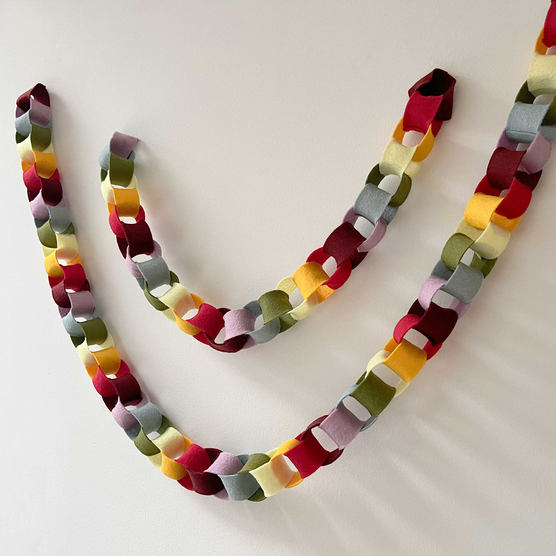 Add cozy texture and modern charm to your space with this handmade wool felt chain garland. Crafted in small Brooklyn batches from premium wool felt, each link brings warmth, color, and a timeless Scandinavian feel — perfect for mantels, shelves, windows, or festive décor all year long.